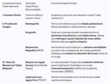 Si las imágenes y la exploración sugieren malignidad, el paso definitivo es la biopsia para obtener tejido. Las principales técnicas son la aspiración con aguja fina (FNAC) y la biopsia con aguja gruesa (core needle biopsy). Esta última es la más empleada, pues proporciona material suficiente para la tipificación histológica y la crucial inmunohistoquímica (que analiza los receptores hormonales y el HER2), toda información imprescindible para la planificación del tratamiento. Por cierto, en muchos centros funciona la "clínica de triple valoración", permitiendo que este proceso de examen, imagen y toma de muestra se realice en una sola visita, lo cual reduce la ansiedad y el tiempo de espera del diagnóstico. La precisión diagnóstica mejora claramente cuando las tres modalidades se utilizan conjuntamente, optimizando así la decisión terapéutica.