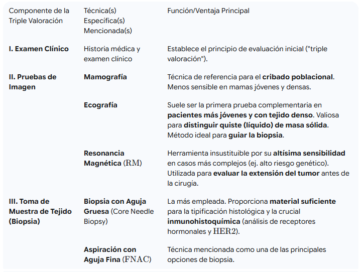 Cuando existe una sospecha mamaria, la evaluación sigue un principio bien establecido en la clínica: el de la "triple valoración". Este proceso combina la historia médica con el examen clínico, se complementa con pruebas de imagen (mamografía y/o ecografía) y, si es necesario, finaliza con la obtención de una muestra de tejido para su estudio. Este enfoque escalonado es el que garantiza la mayor precisión diagnóstica.