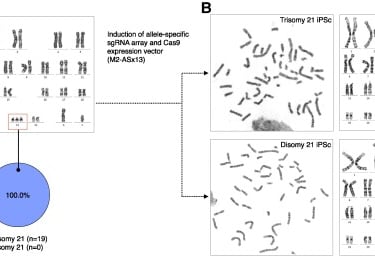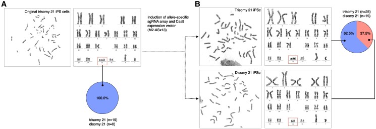 Imagen: Hashizume R, Wakita S, Sawada H, Takebayashi SI, Kitabatake Y, Miyagawa Y, Hirokawa YS, Imai H, Kurahashi H. Trisomic rescue via allele-specific multiple chromosome cleavage using CRISPR-Cas9 in trisomy 21 cells. PNAS Nexus. 2025 Feb 18;4(2):pgaf022.