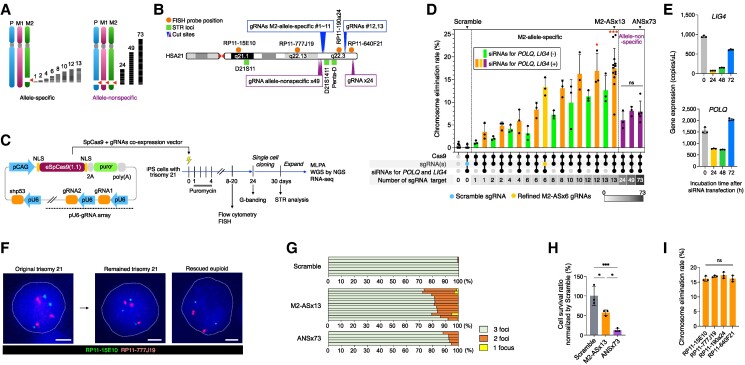 Con el fin de optimizar la corrección cromosómica, se identificaron 15,695 secuencias exclusivas del alelo M2, muchas de las cuales estaban localizadas en la región subtelomérica del cromosoma 21. A partir de estas secuencias, se seleccionaron varias candidatas para evaluar su eficiencia en la inducción de cortes cromosómicos. El análisis mostró que algunos de los cortes realizados eran altamente específicos para el alelo M2, mientras que otros afectaban también secuencias fuera de la región objetivo. Posteriormente, se probó la eliminación del cromosoma extra mediante cortes en diferentes puntos del cromosoma, y se observó que la tasa de eliminación aumentaba conforme se realizaban más cortes. Además, se mejoró el proceso de eliminación al suprimir genes clave involucrados en la reparación del ADN, lo que resultó en un incremento de la tasa de eliminación cromosómica.