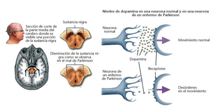 Desde el punto de vista neuropatológico, la enfermedad de Parkinson se caracteriza por la degeneración progresiva de las neuronas dopaminérgicas en la sustancia negra del cerebro, lo que provoca una disminución en la producción de dopamina, un neurotransmisor clave para el control del movimiento. También se observa la acumulación de cuerpos de Lewy, inclusiones intracelulares compuestas principalmente por la proteína α-sinucleína mal plegada.
