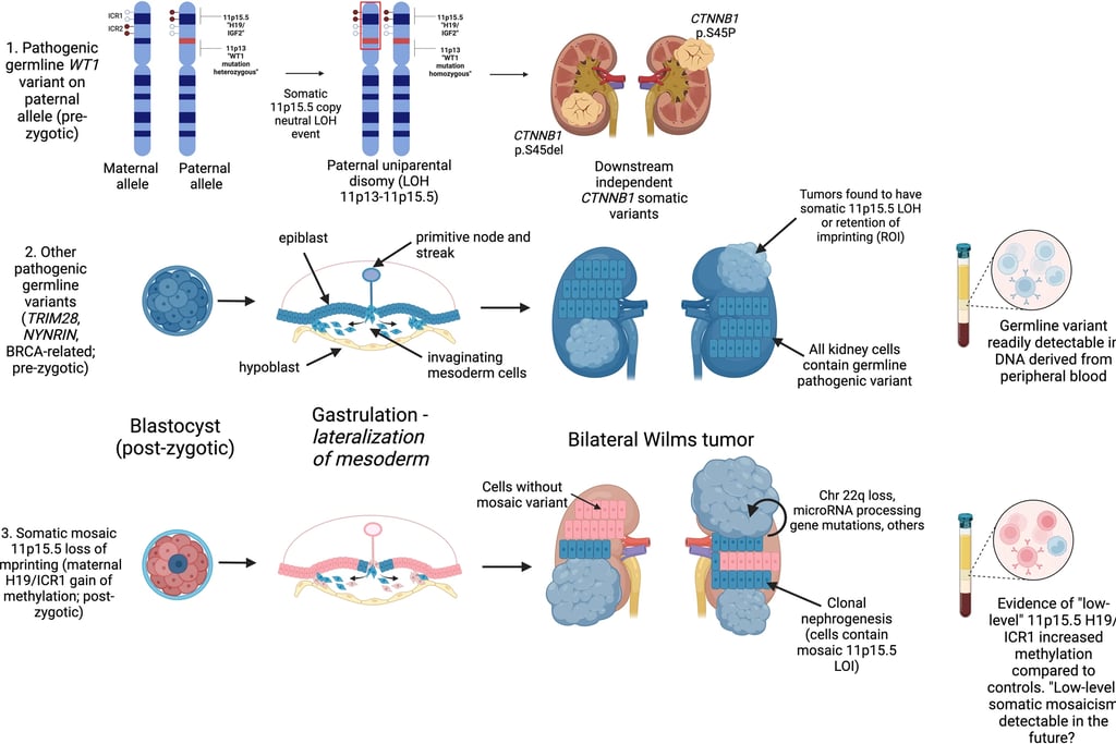 Entre los genes involucrados se encuentran WT1, TRIM28, REST y CTR9, que son específicos del tumor de Wilms, así como otros genes como PALB2 o BLM. Los genes como TRIM28 y REST rara vez mutan somáticamente, lo que indica que sus efectos oncogénicos se restringen a etapas de desarrollo tempranas. El diagnóstico del tumor de Wilms bilateral muestra una distribución bimodal de la edad, lo que sugiere una complejidad genética que no se comprende plenamente. No todos los pacientes portan genes conocidos que predispongan su desarrollo, lo que indica la existencia de factores genéticos adicionales. En un 12% de los casos bilaterales, se han observado cambios epigenéticos y mutaciones heredables que afectan a H19 o IGF2. Aunque algunos casos pueden explicarse debido a un mosaicismo somático temprano, todos los pacientes con tumor bilateral de Wilms deben ser investigados como potenciales portadores de genes que predispongan al cáncer, los cuales podrían transmitirse a la descendencia.