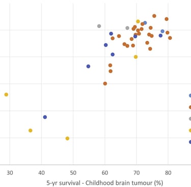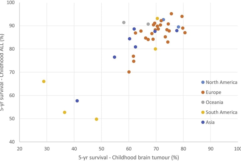 Las tasas de supervivencia varían no solo entre países, sino también dentro de las regiones más desarrolladas, donde no todos los tipos de cáncer infantil presentan el mismo pronóstico. El cáncer linfático agudo (ALL) tiene mejores resultados en comparación con otros tipos, como el cáncer mieloide agudo (AML). Además, enfermedades como el linfoma de Burkitt o el linfoma de Hodgkin, presentan tasas de supervivencia aún más altas. Sin embargo, las diferencias en la supervivencia no solo se deben al tipo de cáncer, sino también a factores sociales y geográficos, lo que resalta la persistente desigualdad en el acceso a la atención médica.