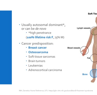 Varios síndromes de predisposición genética están asociados con un mayor riesgo de sarcomas específicos y tumores de tejidos blandos. Probablemente, la asociación más conocida de un síndrome de predisposición al cáncer con sarcoma es el síndrome de Li-Fraumeni. El osteosarcoma es la malignidad más frecuente en niños con síndrome de Li-Fraumeni (30% de todos los tumores), seguido de los sarcomas de tejidos blandos (23% de todos los tumores). Otro caso conocido, aunque raro, de osteosarcoma son las variantes bialélicas en las helicasas de ADN, como BLM (locus 15q26.1), que causa el síndrome de Bloom, y RECQL4 (locus 8q24.3), que causa el síndrome de Rothmund-Thomson.