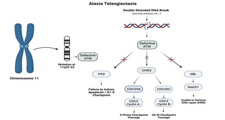 Además, ambos síndromes aumentan el riesgo de leucemia linfoblástica aguda. Variantes en genes relacionados con la reparación del DNA, como el gen ATM y NBN, predisponen a las personas al desarrollo de cánceres linfoides, como la leucemia linfoblástica aguda de células T y el linfoma no Hodgkin, entre otros tipos de cáncer. El desarrollo de inmunodeficiencias es un rasgo distintivo de la mayoría de estos trastornos en la reparación del DNA.