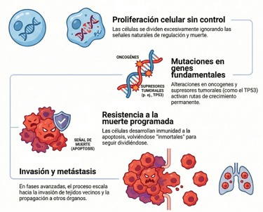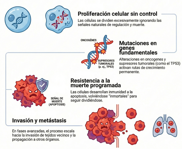 Al alterarse estos componentes, se activan de forma permanente las rutas de crecimiento y, lo que es peor, la célula desarrolla una resistencia a la apoptosis, que es el proceso de muerte programada que debería eliminarla. Sin embargo, al volverse "inmortales" y seguir dividiéndose, el problema escala hasta que, en fases más avanzadas, el cuerpo se enfrenta a la invasión de tejidos vecinos y a la temida metástasis.