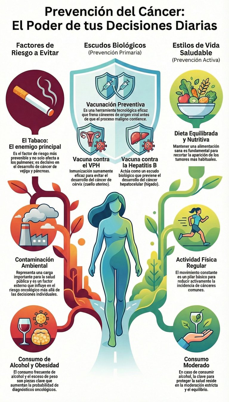 En este sentido, las inmunizaciones dirigidas contra el Virus del Papiloma Humano y la hepatitis B han demostrado ser herramientas sumamente eficaces. Gracias a ellas, es posible evitar el desarrollo de enfermedades tan graves como el cáncer de cérvix y el hepatocelular. Al final, estas vacunas actúan como un escudo biológico que detiene la amenaza mucho antes de que el proceso maligno tenga oportunidad de comenzar.