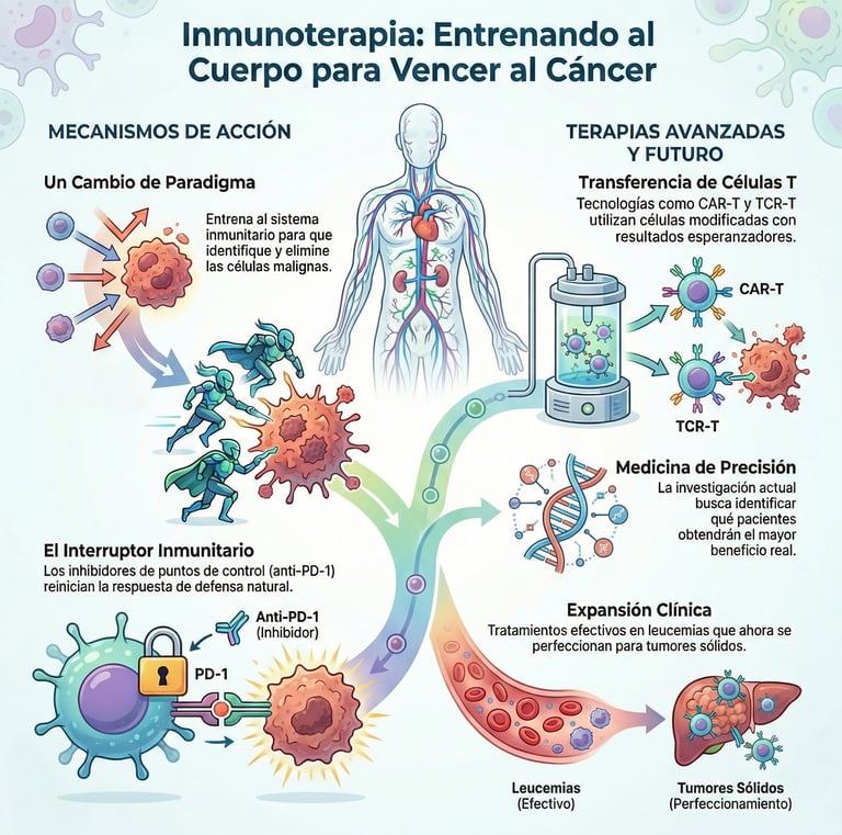 Estamos viviendo un cambio de era en la medicina, y la inmunoterapia es, sin duda, la gran protagonista de este siglo. A diferencia de los métodos tradicionales, esta técnica no ataca directamente al tumor, sino que "enseña" o entrena a nuestro propio sistema inmunitario para que sea él quien identifique y elimine a las células malignas. Es, básicamente, devolverle al cuerpo su capacidad de defensa.