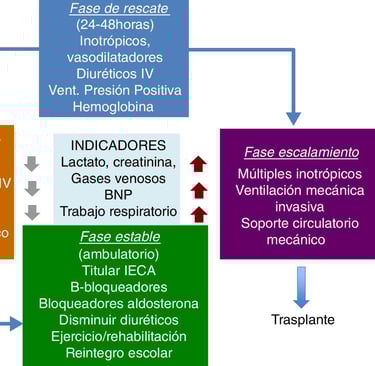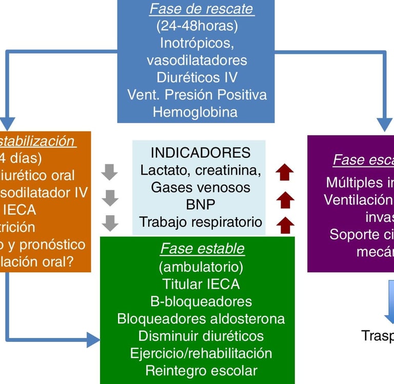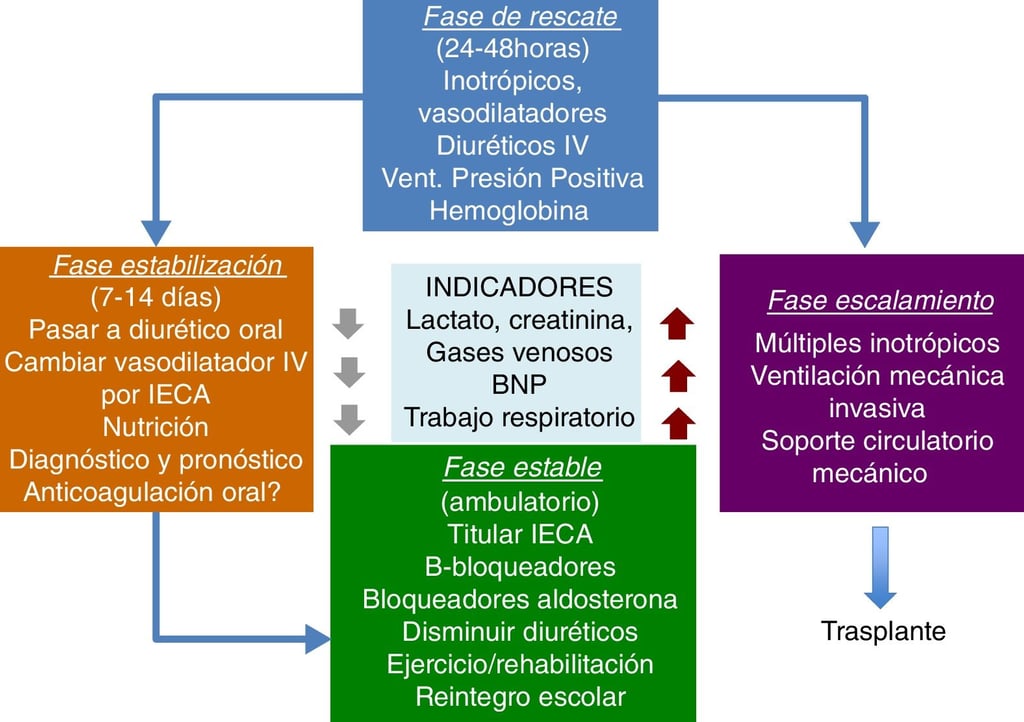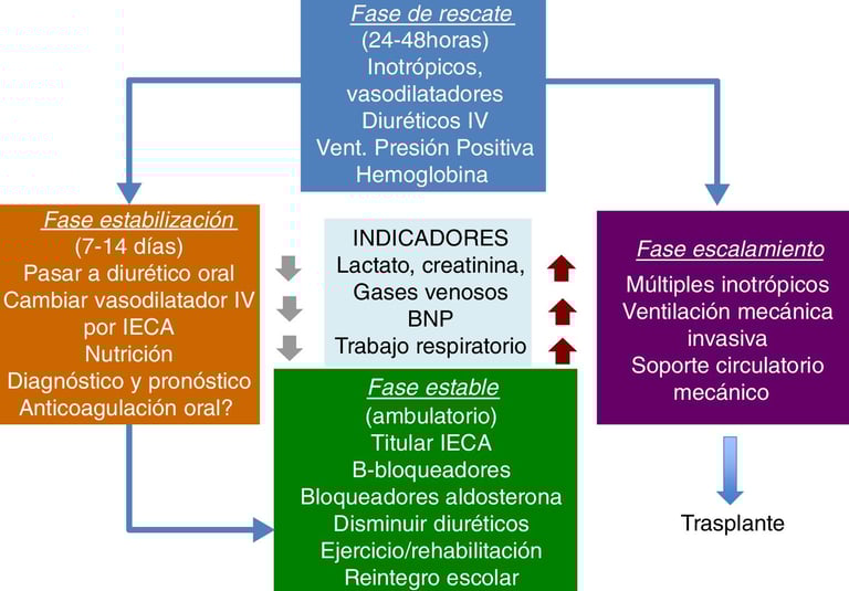 The management of ACHD with heart failure requires individualized evaluation, considering the anatomical and physiological particularities of each patient. Monitoring and medication effectiveness in ACHD present challenges due to the complexity of these conditions. The response to medications can vary significantly, and in some cases, doses must be adjusted based on parameters such as renal function. Additionally, patients with ACHD may have greater frailty, which can influence their tolerance to treatment. In cases of advanced heart failure, hospital management may require the use of vasoactive drugs such as norepinephrine and milrinone to stabilize heart function. As these patients age and develop progressive symptoms of heart failure, advanced therapies, such as mechanical circulatory support or heart transplantation, should be considered to improve clinical outcomes.