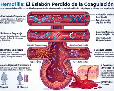 De hecho, cuando todo funciona bien, esta reacción en cadena permite que la sangre pase de estado líquido a sólido justo donde se necesita. Sin embargo, en el caso de la hemofilia, este engranaje se rompe. La falta o el mal funcionamiento del factor VIII o del factor IX interrumpen este flujo de señales, lo que acaba impidiendo la formación adecuada de fibrina. Sin esta sustancia, es imposible que el cuerpo genere coágulos estables capaces de sellar una herida de manera definitiva.