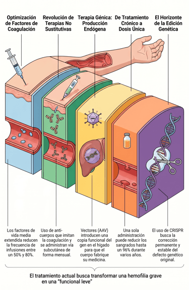 Actualmente, la clave del tratamiento ya no es reaccionar al problema, sino adelantarse a él. El enfoque médico se centra totalmente en la prevención de sangrados. Esto se consigue mediante la administración constante de factores recombinantes o el uso de las llamadas terapias no sustitutivas.
