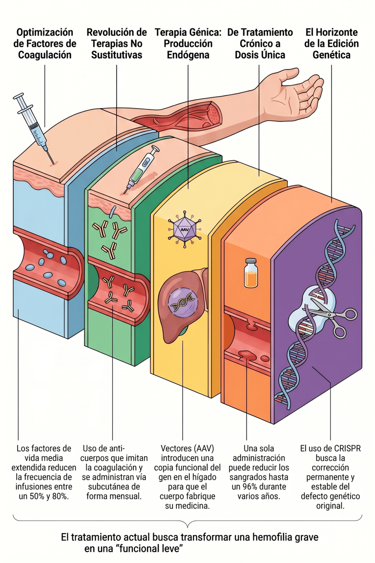 Para terminar este apartado, no podemos ignorar la irrupción de la terapia génica, que ha supuesto un auténtico cambio de paradigma. Estamos hablando de algo que parecía ciencia ficción hace poco: terapias ya aprobadas que permiten que el propio organismo recupere una producción endógena y sostenida de factores de coagulación.