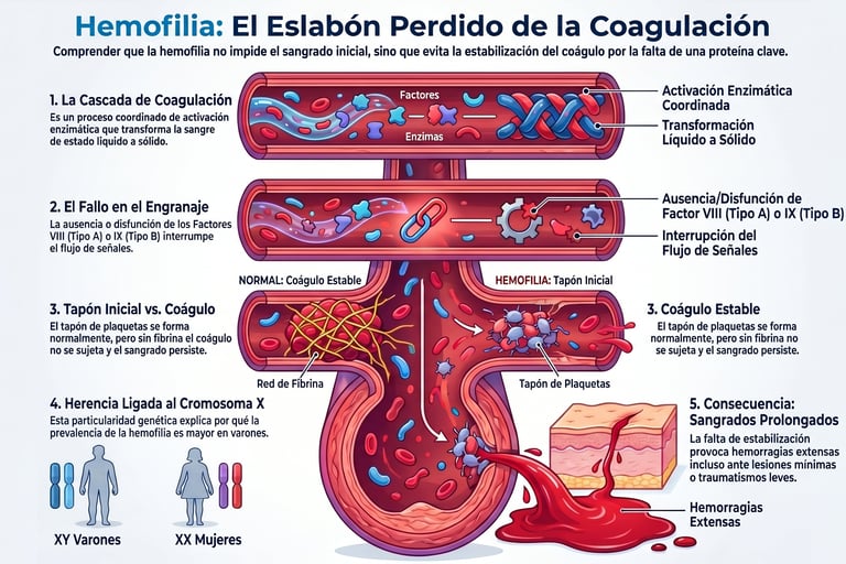 Sin embargo, el verdadero inconveniente surge justo después, ya que la falta de proteínas de coagulación compromete su estabilización. Es decir, el tapón se crea, pero no se "sujeta" bien. Como resultado, los pacientes se enfrentan a sangrados prolongados que pueden volverse un reto importante, incluso cuando se producen ante lesiones mínimas que para cualquier otra persona serían insignificantes.