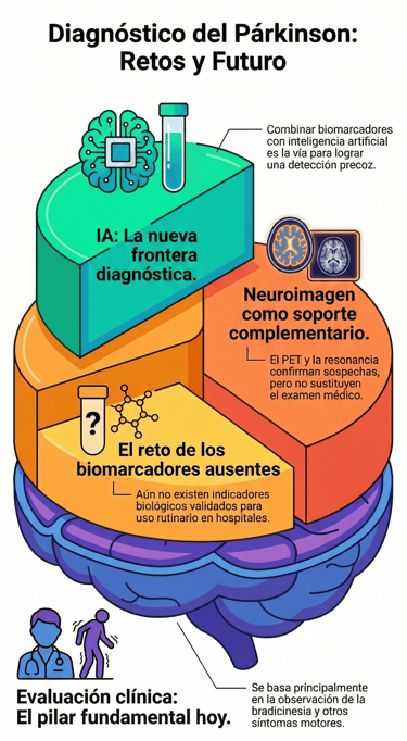 Uno de los puntos clave en este nuevo enfoque es el reconocimiento de la fase prodrómica. Ahora sabemos que la importancia de los síntomas no motores es vital para entender cómo empieza todo. Sin embargo, aquí es donde nos encontramos con una piedra en el camino. A pesar de que el enfoque diagnóstico ha evolucionado muchísimo, todavía sufrimos limitaciones importantes. El motivo principal es que aún nos falta contar con biomarcadores validados que nos den una respuesta clara y definitiva en las consultas del día a día.
