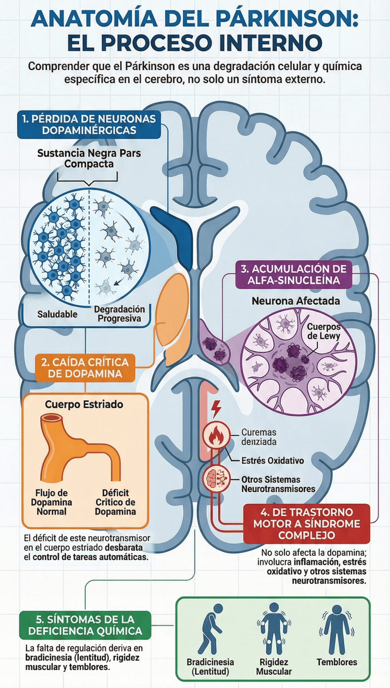 Sin embargo, la visión médica ha cambiado mucho recientemente. Hoy sabemos que este trastorno no es puramente dopaminérgico, ya que también se ven afectados otros sistemas neurotransmisores. Esta complejidad explica por qué los síntomas pueden ser tan variados entre una persona y otra.