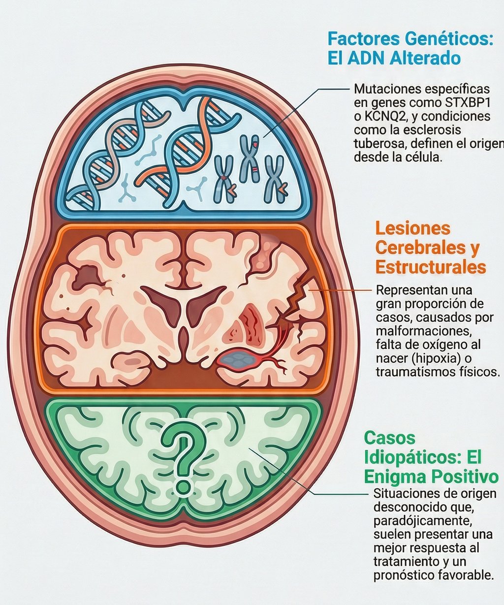 Dicho esto, la forma de entender este problema ha evolucionado mucho últimamente. Hoy en día, se reconoce que no estamos ante una enfermedad única con una sola causa, sino ante un fenotipo común. Básicamente, lo que ocurre es que existen múltiples etiologías o causas diferentes que acaban provocando un fallo similar en las redes neuronales inmaduras del lactante.