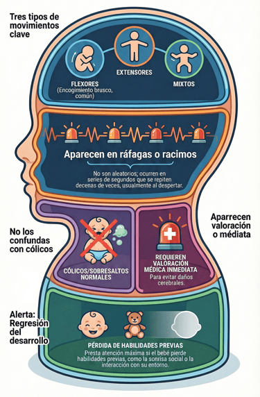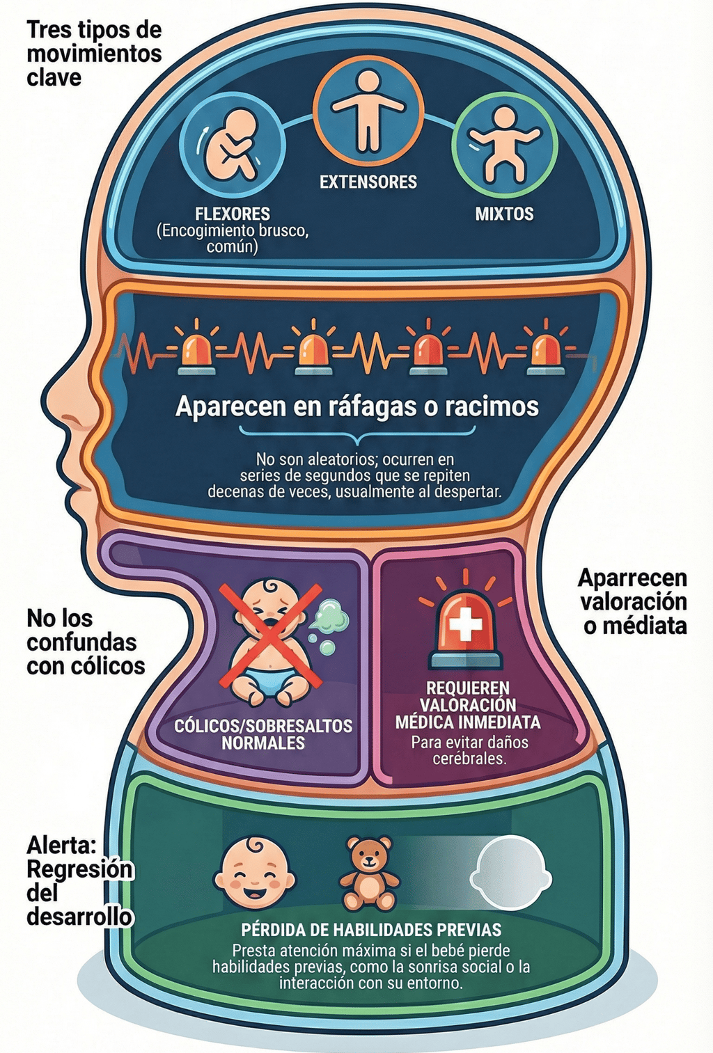 De hecho, los que se ven con más frecuencia son los de tipo flexor. Estos se reconocen por un encogimiento brusco del tronco acompañado de una flexión de las extremidades. Aunque parezcan movimientos aislados, entender esta clasificación es el primer paso para saber ante qué nos encontramos.