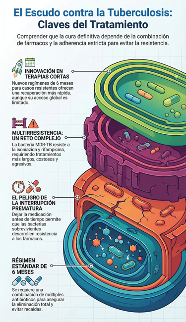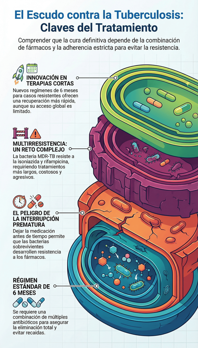 Cuando nos enfrentamos a una tuberculosis que todavía es sensible a fármacos, el protocolo habitual no es precisamente rápido. De hecho, lo más normal es que el proceso se alargue, como mínimo, durante seis meses. Durante todo este tiempo, es necesario combinar múltiples antibióticos. No es por capricho de los médicos; esta mezcla es la única forma realmente eficaz de asegurar que el paciente no sufra recaídas y, sobre todo, de evitar que el patógeno desarrolle resistencias que compliquen todo el cuadro clínico.